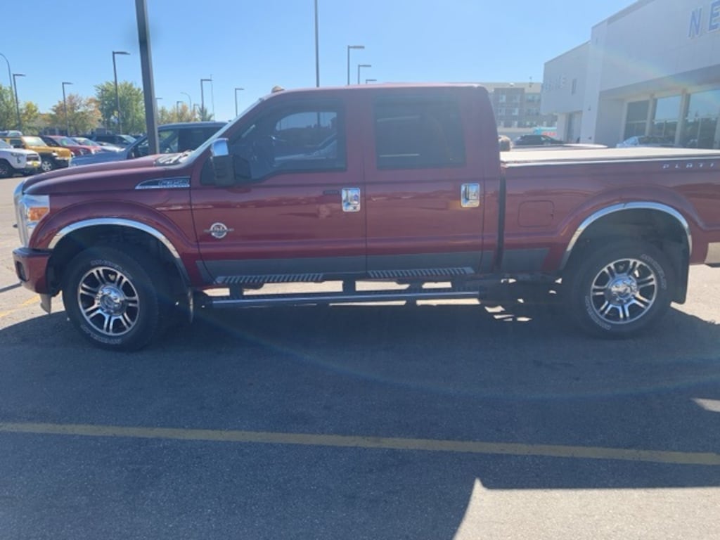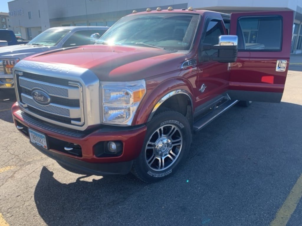 2014 Ford F-350SD Platinum *Great Local Trade-in, *This vehicle has a Clean History Report!, *4x4, *Moonroof, *Leather, 20" Platinum Cast Aluminum Wheels, 6" Angular Chrome Step Bars, ABS brakes, Body-Color Front & Rear Bumpers, Bright Chrome Door & Tailgate Handles, Chrome Exhaust Tip, Chrome Skull Caps on PowerScope Mirrors, Electronic Stability Control, Front dual zone A/C, Heated door mirrors, Illuminated entry, Low tire pressure warning, Memory Power Adjustable Pedals, Navigation System w/HD & Satellite Broadcast, Platinum Package, PowerScope Trailer-Tow Mirrors, Premium Leather-Wrapped/Wood Steering Wheel, Remote keyless entry, Remote Start System, Tailgate Step & Handle, Traction control, Unique Platinum Leather 40/Console/40 Seats, Unique Satin Chrome Grille, Universal Garage Door Opener. Ruby Red Metallic Tinted Clearcoat Odometer is 8491 miles below market average! 4WD